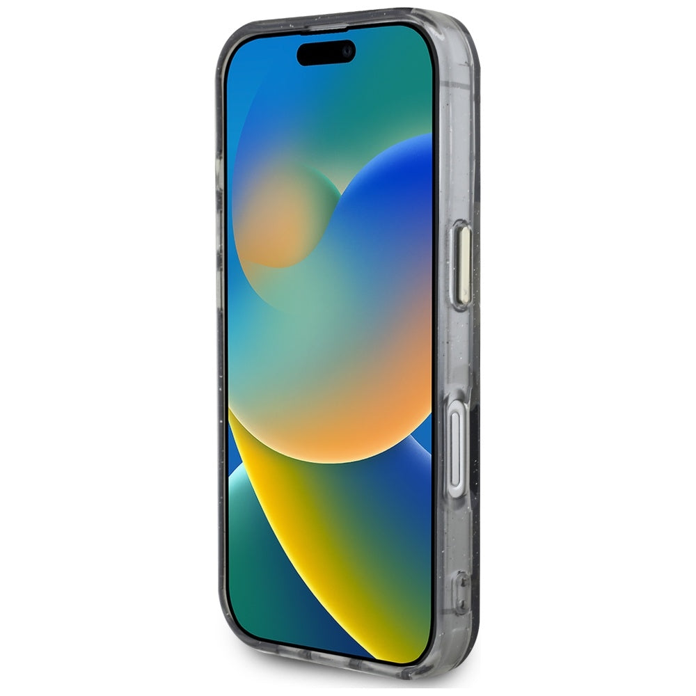 Husa MagSafe pentru Apple iPhone 16, Guess, IML Metal Glitter Flowers Triangle, Neagra