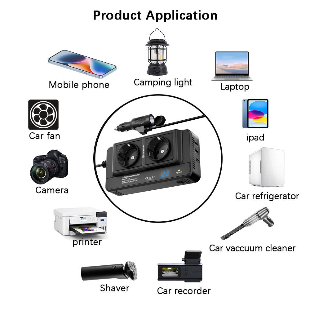 • Invertorul converteste tensiunea de 12V DC in 220V AC, oferindu-ti posibilitatea de a conecta laptopuri, camere, mini-frigidere sau alte dispozitive electrice oriunde te afli.